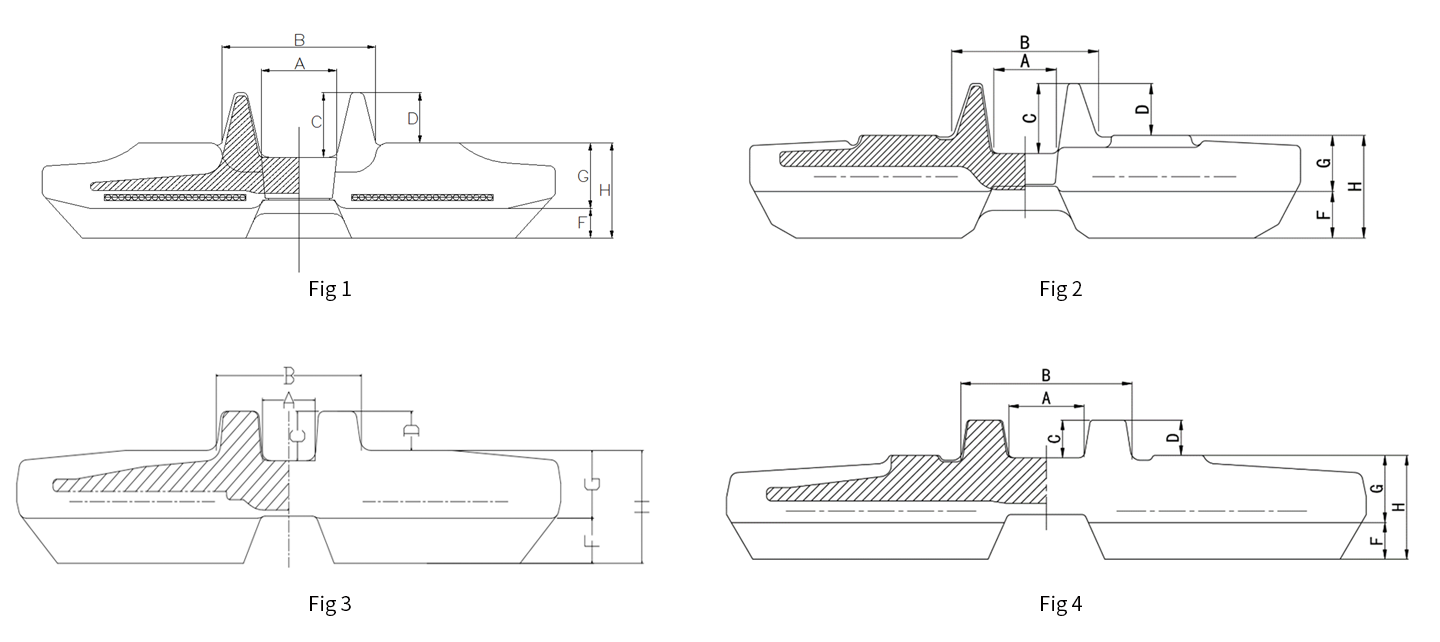 | 履帶規(guī)格 (寬度x節(jié)距) Track Size (WidthxPitch) | 內(nèi)軌寬度 Inner Guide Width (A) | 外軌寬度 Outer Guide Width (B) | 齒內(nèi)高度 Inner Height (C) | 齒外高度 Outer Height (D) | 履帶厚度 Track Thickness (H) | 截面示意圖 Section View | 支承類型 Gude Type | 傳統(tǒng)型 Traditional | 抗震型 AVT |